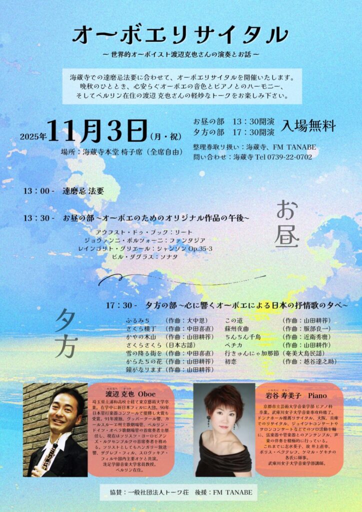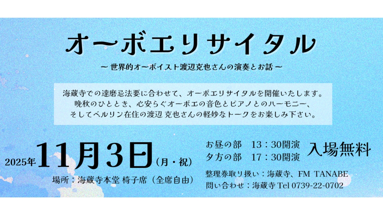 「オーボエリサイタル~世界的オーボイスト渡辺克也さんの演奏とお話~」 開催のお知らせ