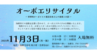 トーワ荘ブログ 「田辺市・海蔵寺本堂でオーボエリサイタル開催!」(’25 / 11 / 3) 2025年9月28日今年の11月3日(月・祝)「文化の日」に、田辺市・海蔵寺で開催される恒例の達磨忌に合わせて、本堂にて、ベルリン在住の世界的オーボイスト「渡辺克也さん」のオーボエリサイタルが開催されることになりました。(協賛:一般社団法人... 2025.10.20 トーワ荘ブログ